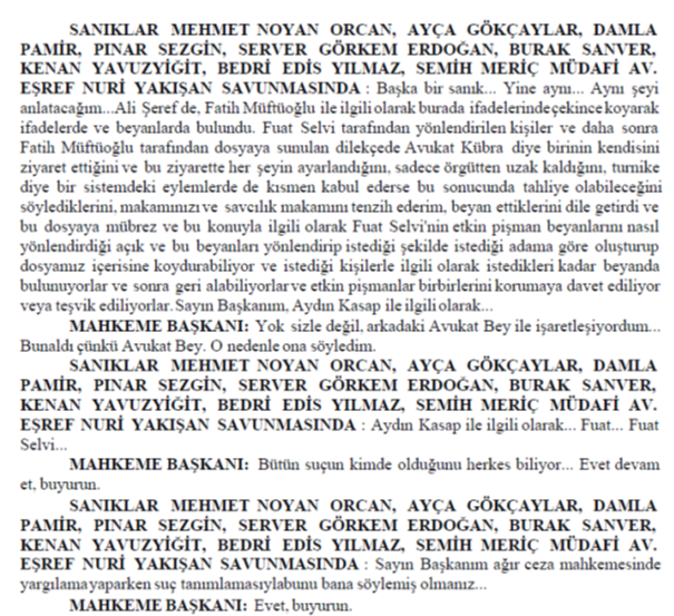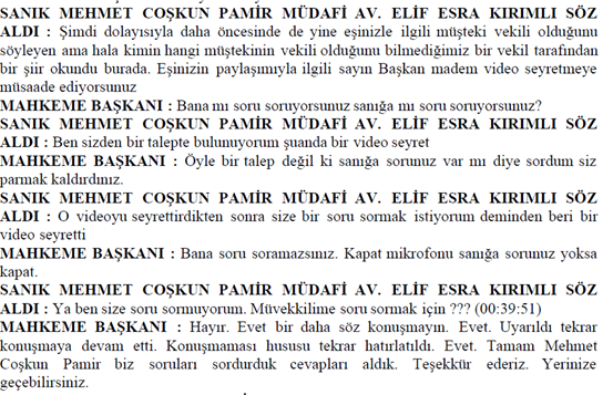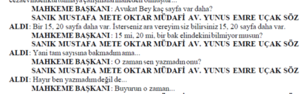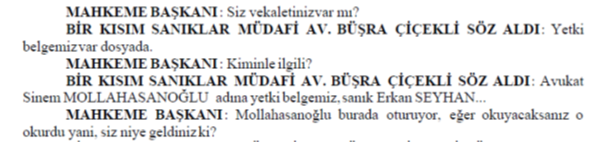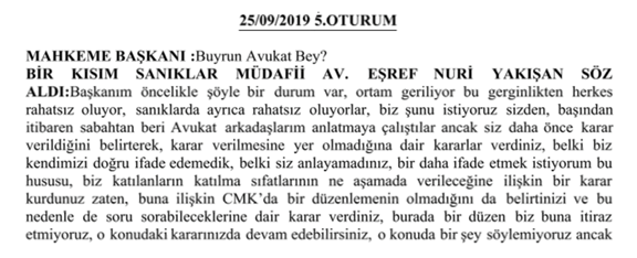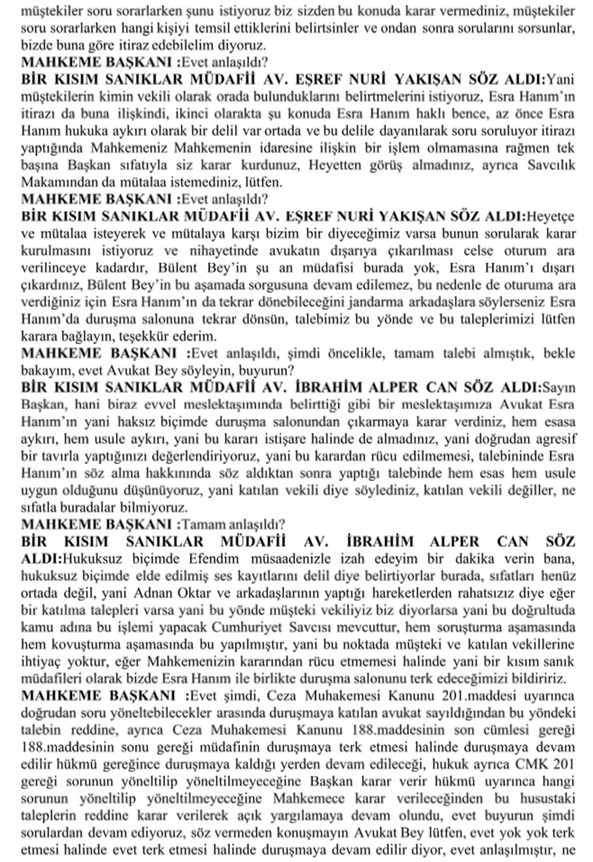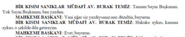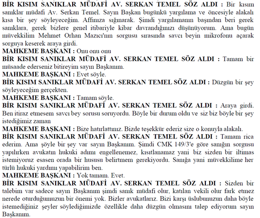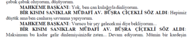 ADI VE SOYADI BELİRLENEMEYEN ERKEK AVUKAT SÖZ ALARAK: Sayın başkan peki usuli durumlarda siz bana söz verdiniz ya şimdi. Ben buradaki bütün sanıkların savunması bitene kadar. Şimdi burada usuli bir hata varsa ben CMK’ya göre buradaki usuli durumu hatırlatmak ile mükellefim. Siz de bunları karara bağlamak ile mükellefsiniz. Yani böyle bir usul anlayışı yok. Bakın burada yanlış usul uyguluyorsunuz. Lütfen bunlara dikkat edin. En azından usuli olarak madem yanlış yapacağız, bari şunu yapalım: müşteki tarafa söz verdiğiniz kadar lütfen bu tarafa da söz verin ve mikrofonlarımızı