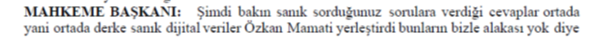 MAHKEME BAŞKANI : KAPAT MİKROFONU. Evet başka sorusu olan? Yok. Tamam teşekkür ederiz geçebilirsin yerine. Bir 10 dakika ara verelim, 10 dakika sonra kaldığımız yerden devam edeceğiz, yerinegeç.