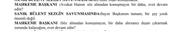 MAHKEME BAŞKANI: Ama, ama, ama ben burada size yani huzurdaki sanığın beyanına karşı söz verdim. Siz başka şeyler anlatıyorsunuz. O neden ile kesmek zorunda kalıyorum.