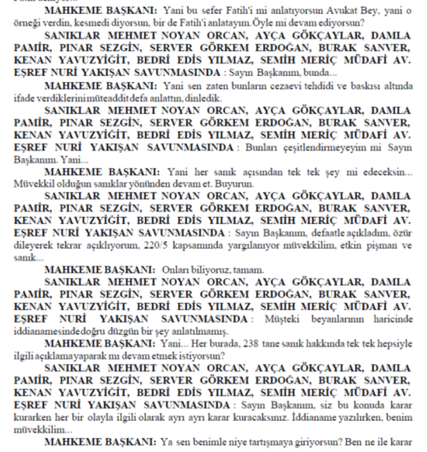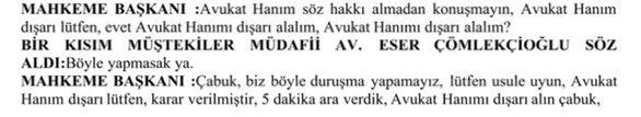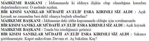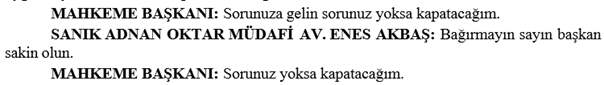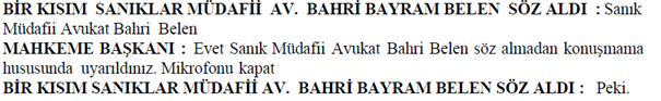 MAHKEME BAŞKANI : Kesiyorum kes bakayım. Kes bakayım. Kes bakayım. Evet. Konuşmayın söz hakkı almadan konuşma. Dışarı atılırsın. Evet avukat beyi dışarı alın. Görevliler avukat beyi dışarı alın çabuk. Hemen. Görevliler beklemeyin. Beklemeyin çabuk. Söz hakkı verilmeden konuştuğu için dışarı alınmasına karar verdik evet. Duruşmaya 5 dakika ara veriyoruz.