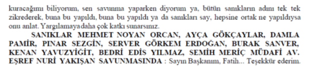 BİR KISIM SANIKLAR MÜDAFİ AV. EŞREF NURİ YAKIŞAN SÖZ ALDI : Bir şey hatırlatacağım.