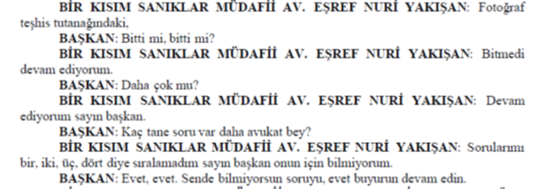MAHKEME BAŞKANI: Soru sorma hakkına karışmayın, söz hakkı almadan konuşma Avukat Bey bir daha.