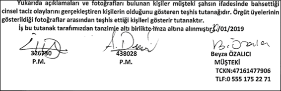 “Emniyete ikinci defa cinsel tacize uğradığım kişileri tespit etmem için çağırdılar. Telefonla arayıp gelmem gerektiğini söylediler… Yüzlerce erkeğin fotoğrafını gösterdiler ve taciz edenleri söyle dediler. Bu şekilde kişileri seçtim.”