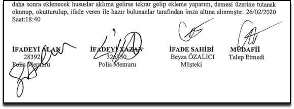 Sahte imzanın bulunduğu evrakta, yanyana olan “İFADE SAHİBİ” ve “MÜDAFİİ Talep Etmedi” kısımlarında yer alan imzalar da, kendi yerleşik imzasına sahip Beyza Özalıcı’ya değil, onun yerine imzasını taklit eden kişiye ait olduğu için, bu kişi iki imzayı birbirine benzetememiştir.