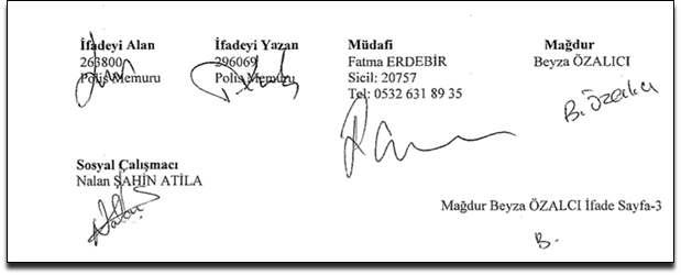 Müşteki Beyza Özalıcı’nın mahkeme ifadesine göre sadece 2 kere İstanbul Emniyet Müdürlüğü’ne ifadeye gittiğini söylemesine rağmen, dosyamızda ilk ikisinden farklı bir tarihe ait üçüncü bir ifadesi daha olduğu görülmektedir: