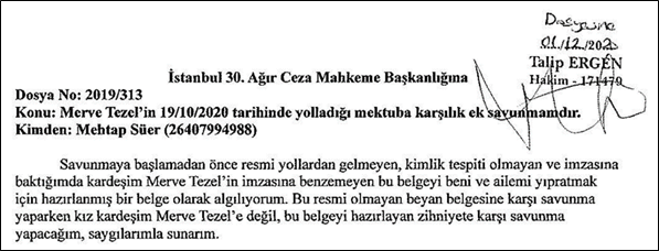 Merve Tezel’in öz kardeşi olan sanık Mehtap Süer, 01.12.2020 tarihinde sunduğu dilekçesinde, müşteki Merve Tezel’in dosyaya sunulan 19.10.2020 tarihli beyanındaki imzanın sahte olabileceğini şöyle belirtmiştir: