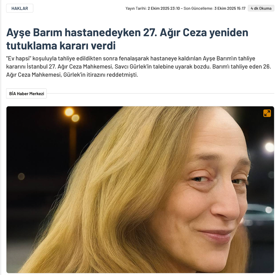 Tahliyesinden sonra tutuklanan ilk örnek, Ayşe Barım değildir. Ne acıdır ki bu uygulama, ÖNCE MÜVEKKİLİN ARKADAŞLARI ÜZERİNDE DENENMİŞ, buna SES ÇIKARILMAYINCA da herkese, özellikle de ses çıkarmayanlara sirayet eder hale gelmiştir.
