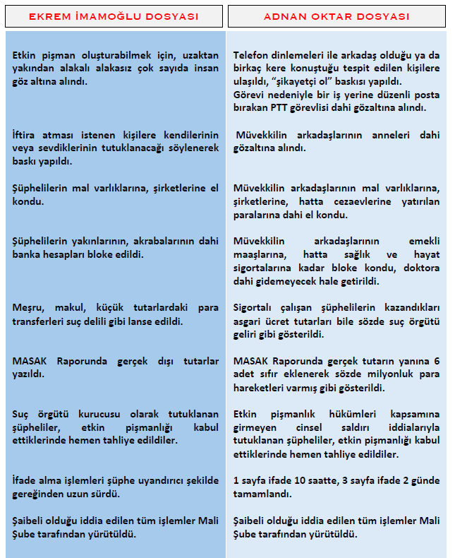 Fatih Altaylı’nın da sıkça gündeme getirdiği Ekrem İmamoğlu Soruşturması’nda özellikle muhalif kesimler tarafından eleştiri konusu yapılan uygulamalarla bazı kıyaslamalar yaparak bugünlere Adnan Oktar Soruşturması’ndan başlanarak gelindiği açıkça görülmektedir: