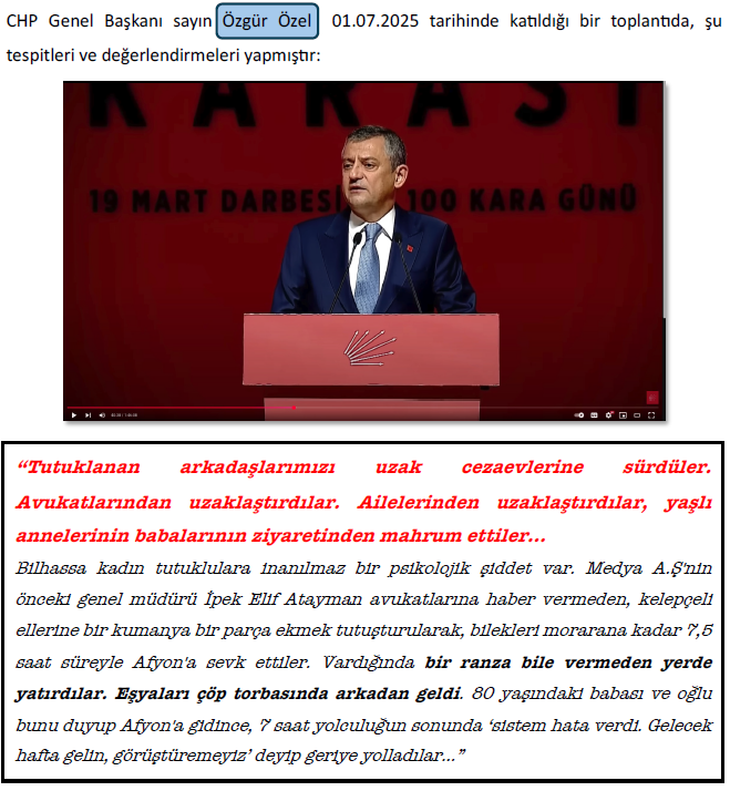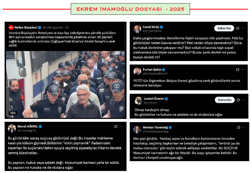 Görüldüğü gibi Ekrem İmamoğlu’nu da kapsayan soruşturmalardaki işlemlerin aynısı (bahsettiklerimiz dışında başka benzerlikler de vardır), hatta burada konumuz dışı kaldığı için anlatmamızın bir gereği olmayan daha fazlası müvekkil ve arkadaşlarıyla ilgili yargılama sürecinde de gözlemlenmiştir.