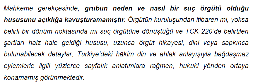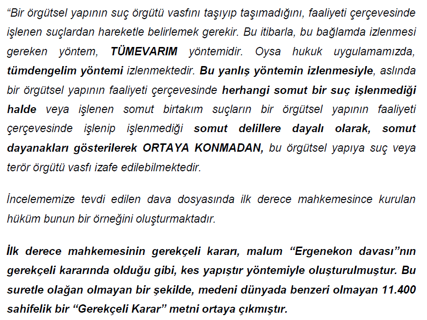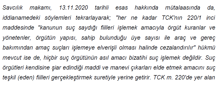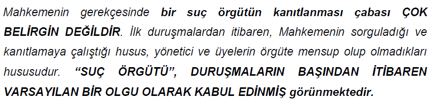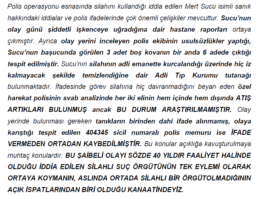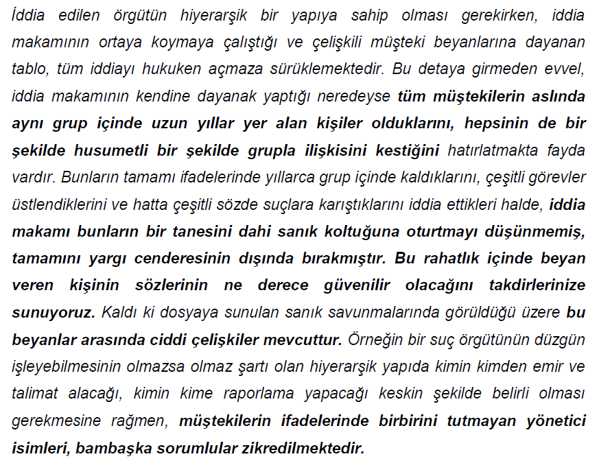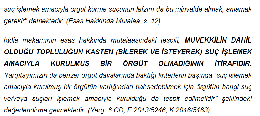 Müvekkil ve arkadaşlarına yönelik silahlı suç örgütü isnatlarının yersiz olduğu hakkında verilen bazı mütalaa ve savunmalardan bölümler ise şöyledir: