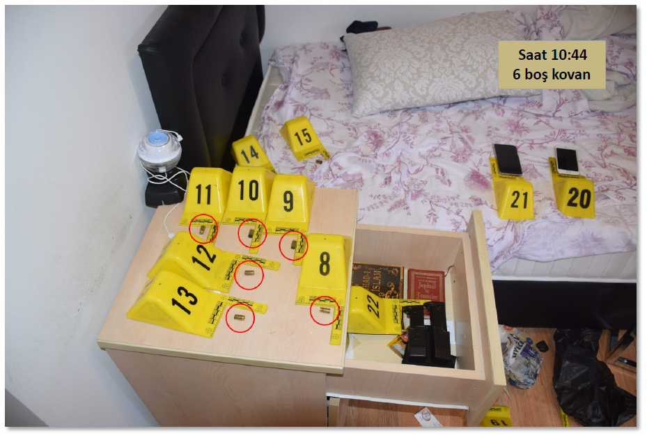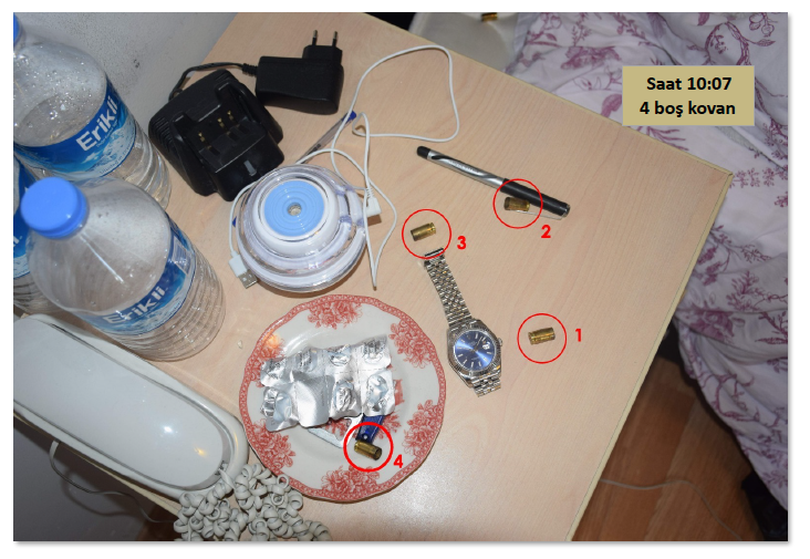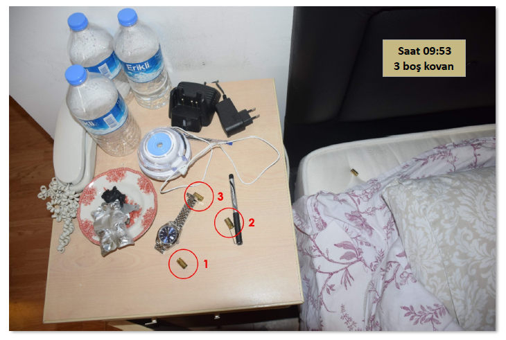 - Olay yeri fotoğraflarında dikkat çekici detaylar vardır. YATAK BAŞUCUNDAKİ KOMODİN ÜZERİNDE DAHA ÖNCE VAR OLMAYAN KOVANLAR GÖRÜLMEKTEDİR. 09:53’de çekilen fotoğrafta 3 BOŞ KOVAN varken, 10:17’de çekilen fotoğrafta 4 BOŞ KOVAN, 10:44’de çekilen fotoğrafta ise aynı noktada 6 BOŞ KOVAN VARDIR. Olay mahallinde 10 adet kovan bulunmasına rağmen yalnızca 5 adet mermi çekirdeği bulunmuştur.