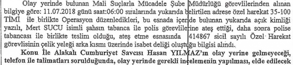11.07.2018 TARİHLİ POLİS OPERASYONU’NDA BAZI POLİSLERE ATEŞ AÇTIĞI İLERİ SÜRÜLEN MERT SUCU’NUN KOMPLO MAĞDURU OLDUĞUNU ORTAYA KOYAN BAZI DELİLLERİMİZ: