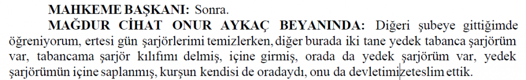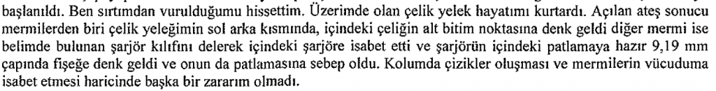 - Aşağıda alıntı yaptığımız olay yeri inceleme raporunda, Cihat Onur Aykaç’ın çelik yelekten isabet aldığı ifadesi yer alırken, şarjör kılıfından vurulduğu ve hafif yaralandığı konusunda ilginç bir şekilde tek bir kelime bile yer almamaktadır: