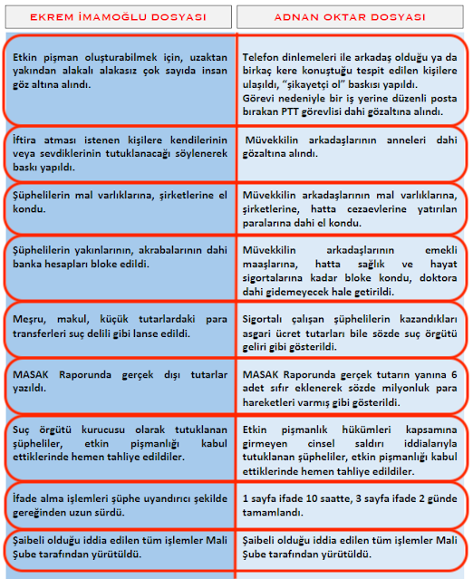 Örneğin Ekrem İmamoğlu Soruşturması’nda, özellikle muhalif kesimler tarafından eleştiri konusu yapılan uygulamalarla bazı kıyaslamalar yaparak, bugünlere Adnan Oktar Soruşturması’ndan başlanarak gelindiği, aşağıda sadece bir kısmına yer verebildiğimiz benzerlikler sayesinde açıkça görülmektedir: