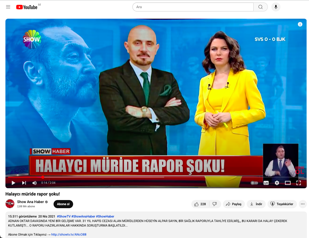 Müvekkil Adnan Oktar’ın arkadaşlarından Hüseyin Alpar Sayın, hayati tehlikesi bulunan ağır bir hastalığı olması sebebiyle hakkında düzenlenen devlet hastanesi heyet raporunun ardından tahliye edilmiştir. Tahliyesinin ardından bir kısım medya tarafından hakkında haber yapılarak hedef gösterilen Hüseyin Alpar Sayın hakkındaki heyet raporu bozdurularak apar topar bozularak tekrar tutuklanmış ve yeniden cezaevine gönderilmiştir. Hüseyin Alpar Sayın hakkında yapılan hedef gösterici haberlerden birisini de şu an Halk TV’de ana haber sunucusu olan Ece Üner yapmıştır. 20 Nisan 2021 Tarihli Show TV Ana Haber bülteni yayınını, Show TV’nin Youtube hesabında izleyebilirsiniz. Yayın linki ve haberin kapak fotoğrafı aşağıdadır.