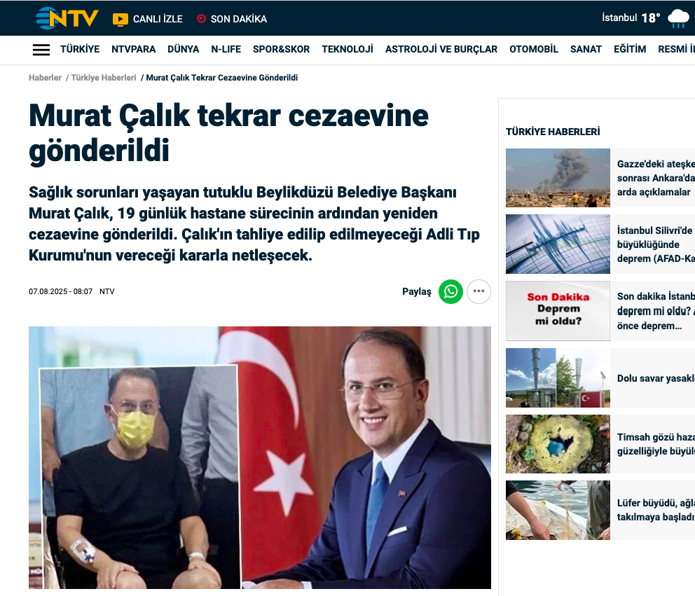 Adnan Oktar davasında yaşanan ağır hastalıkları olan kişilerin bile önce salıverilip ardından tekrar tutuklanmaları vakıasının bir benzeri daha sonra İBB Davası olarak bilinen davalarda da yaşanmış; Ekrem İmamoğlu’nun avukatı hastalığı sebebiyle önce salıverilmiş ardından ise tıpkı Hüseyin Alpar Sayın gibi tekrar tutuklanmış ve cezaevine gönderilmiştir. Habere ilişkin detayları NTV Haber Sitesi’nin 7 Ağustos 2025 Tarihli bülteninden okuyabilirsiniz. İlgili yayın linki ve kapak fotoğrafı aşağıdadır.