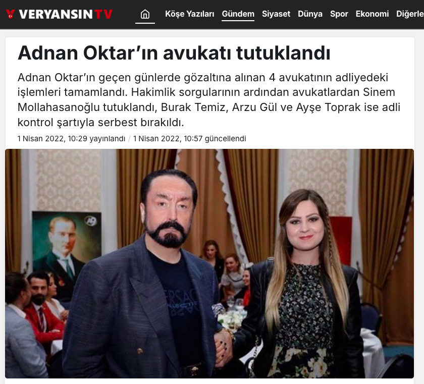 Adnan Oktar Davası yargılamalarında müvekkil ve arkadaşlarının savunma gücünü kırmak ve kendilerini adil şekilde savunmalarına engel olmak amacıyla sanıklarla birlikte avukatlarının da gözaltına alındıkları, bir kısım sanık avukatlarının da tutuklandığı bilinmektedir. Konuya ilişkin olarak basına yansıyan haberlerden, 1 Nisan 2022 Tarihli Veryansın TV haberinin kapak fotoğrafı ve ilgili yayın linki aşağıdadır.