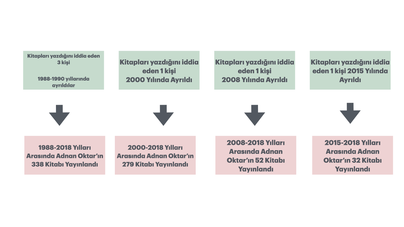 Aşağıdaki şemada, kitapları yazdıklarını iddia eden kişilerin camiadan hangi yılda ayrıldıkları ve o yıldan sonra kaç kitabının yayınlandığı sayılarla belirtilmektedir: