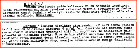 “Sanığın gözaltına alınışından 62 saat sonra yapılan tahlil sonucu belirlenen miktarın 5 mg/ml’nin üzerinde bir sonucun çıkmasının mümkün olmayacağı dosyadaki Adli Tıp raporları ve delillerle anlaşılmakta olup, sanığın olaydan önce bir müddet annesine ait eve uğramadığı, kendisine karşı husumet duyan kimseler tarafından komplo sonucu eve bırakılmış olabileceği bildirilmiş olup, sanığın savunmalarının aksine deliller de bulunmamaktadır.”