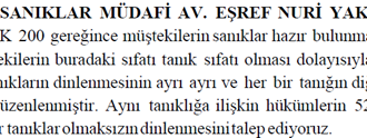 2.19.MAHKEME HEYETİ BİR KISIM SANIKLAR MÜDAFİİ AV. EŞREF NURİ YAKIŞAN HAKKINDA SUÇ DUYURUSUNDA BULUNMUŞ VE AÇILAN DAVAYI HUZURDAKİ DOSYA İLE BİRLEŞTİRMİŞTİR. BU SAYEDE DİĞER SANIK AVUKATLARI ÜZERİNDE BASKI KURMAYI HEDEFLEMİŞTİR